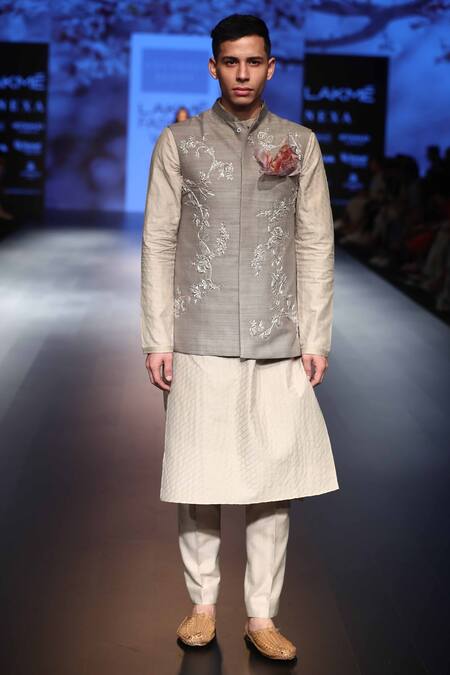 Grey Nehru jacket with all-over floral motif work. Comes with straight kurta & churidar.
