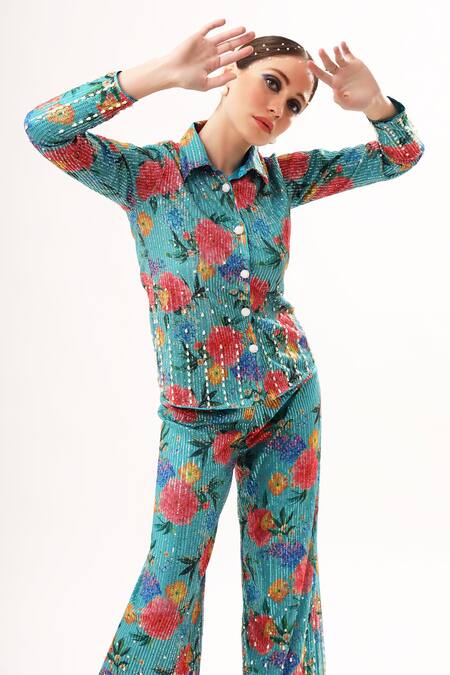 Green Net Printed And Embroidered Floral Sequin Shirt & Pant Set