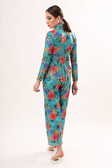 Turquoise net shirt featuring a collared neck, full sleeves, and embellished buttons. Paired with printed embroidered pants adorned with a pearl work border.