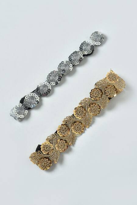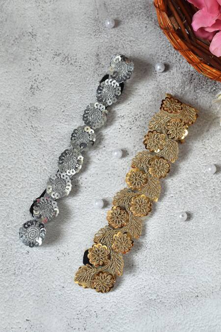 Silver, gold headbands with floral, sequin, zari embroidery.