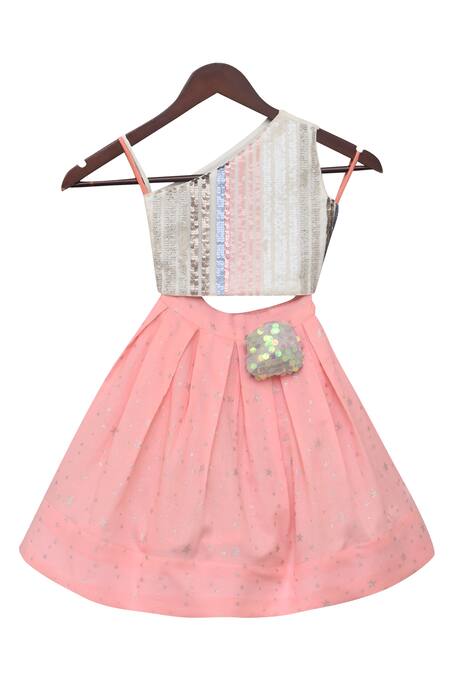 Let your little one sparkle and shine as she wears this white, one-shoulder top embellished with multi-color sequins and paired with peach hued, pleated skirt adorned with starry details. The skirt is decked with a tiny sequin embroidered attached pocket.