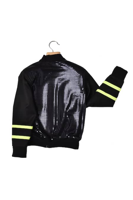 Black lycra lined sequinned jacket featuring neon detailing and ribbed cuffs