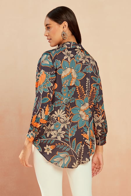 Pleated sleeve details, Shirt collar design, Vibrant botanical print
