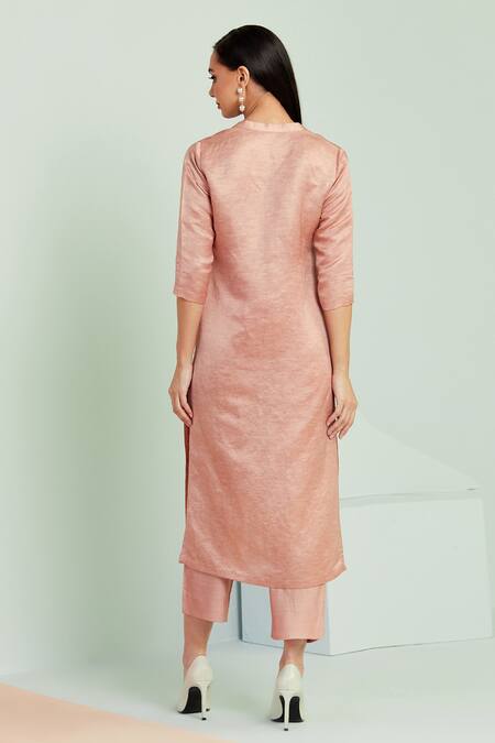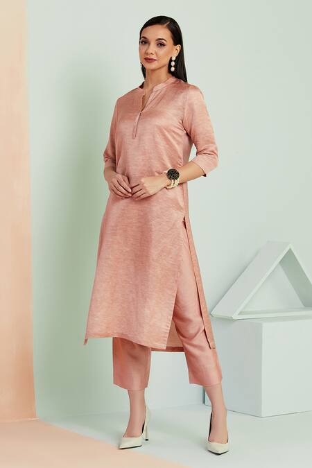 Dusty pink straight kurta featuring a notched neckline and side slits. Paired with a matching straight pant, made from a linen silk viscose blend.