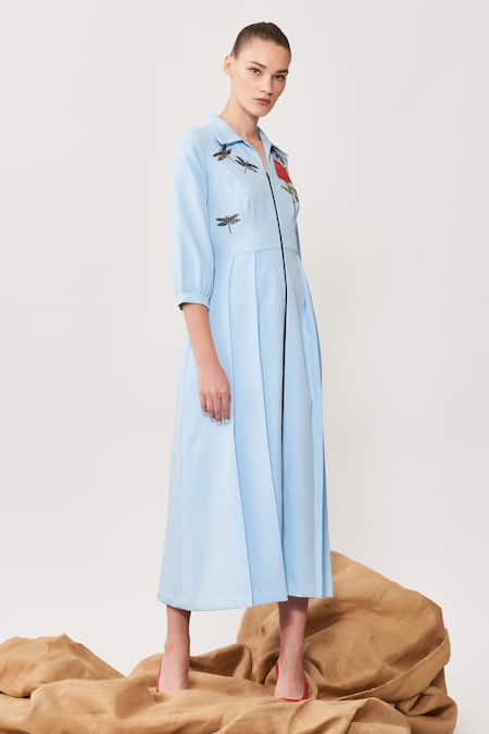 Buy_Shahin Mannan_Blue Soft Gaberdine Floral, Dragon Fly Motifs Collared Calender Back Open Dress_at_Aza_Fashions