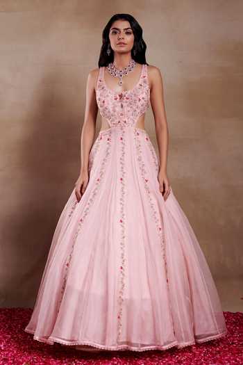 Frosty pink gown featuring all-over floral embroidered motifs and cutouts at the waist and back