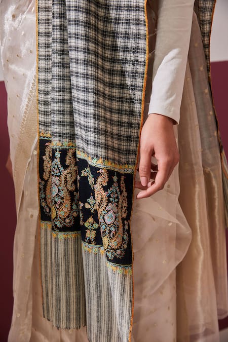 Black and white stole featuring checkered woven motifs and thread embroidery in a paisley pattern along the border