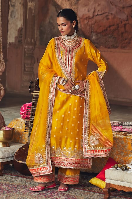 A mustard yellow long A-line kurta crafted from silk chanderi, featuring a zero neckline with placket, three-quarter sleeves, and intricate Kashmiri Tilla and Gota Patti embroidery highlighted with pearls and sequins. It is paired with coordinating silk chanderi palazzos and a silk organza dupatta, both finished with delicate gota detailing.