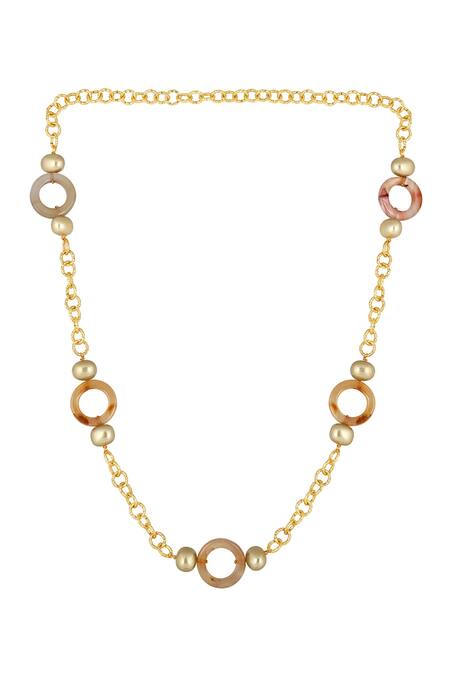 Gold polished brass long necklace featuring textured chain with placement shaded brown natural onyx stones and cream shell pearls