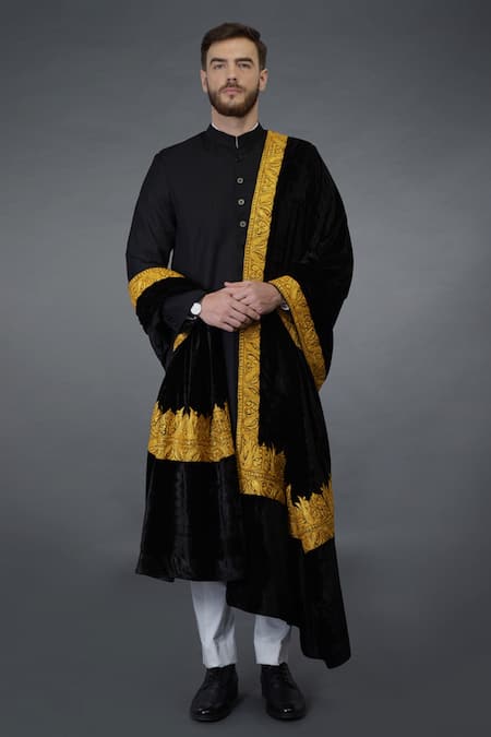 Black wool blend achkan sherwani paired with silk velvet Kashmiri tilla embroidered shawl. Comes with off white pure cotton breeches.