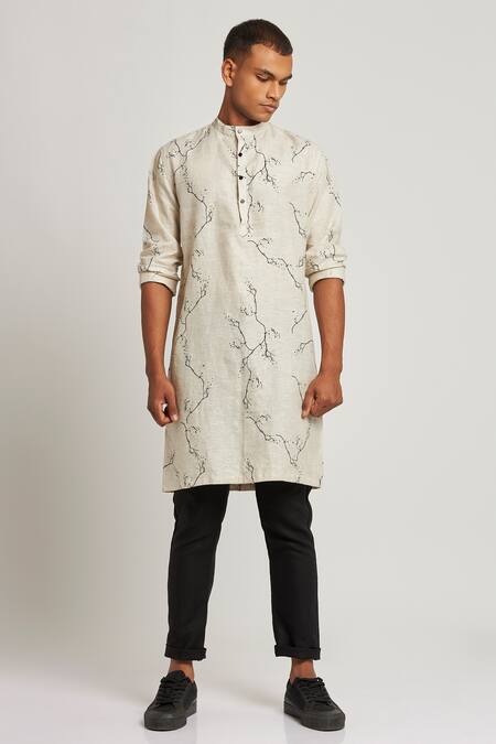 Ivory 100% Linen Printed Twig Sherwood Kurta