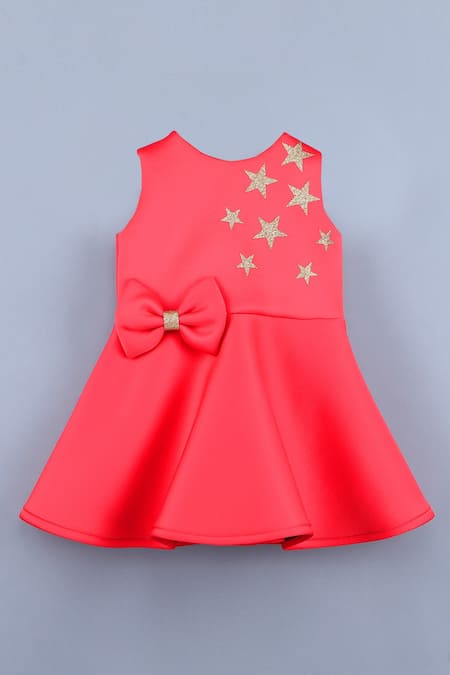 Neon pink dress with star shimmer motifs & 3D bow detail.