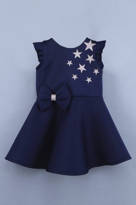 Dark blue dress with star shimmer motifs & 3D bow detail.