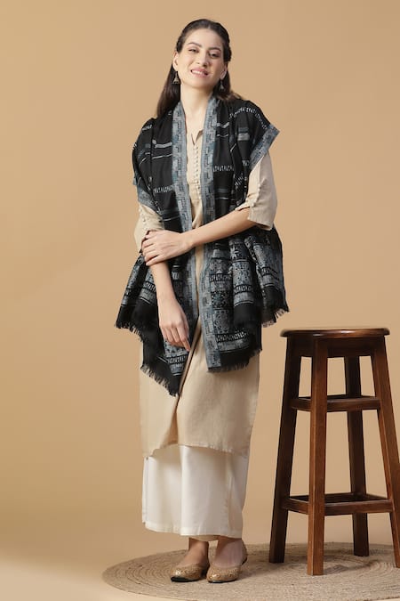 Black Stripe Woven Pattern Kiyana Jacquard Wool Shawl