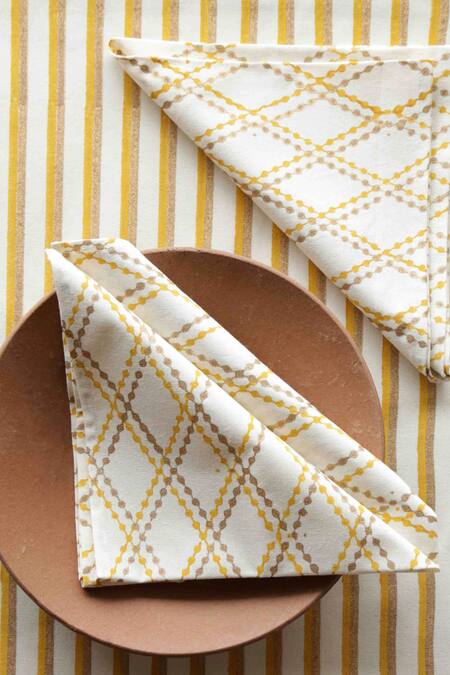 Ecru cotton rectangle-shaped placemat with all-over hand block printed gold-yellow striped detail. Comes with geometric checkered pattern napkin.