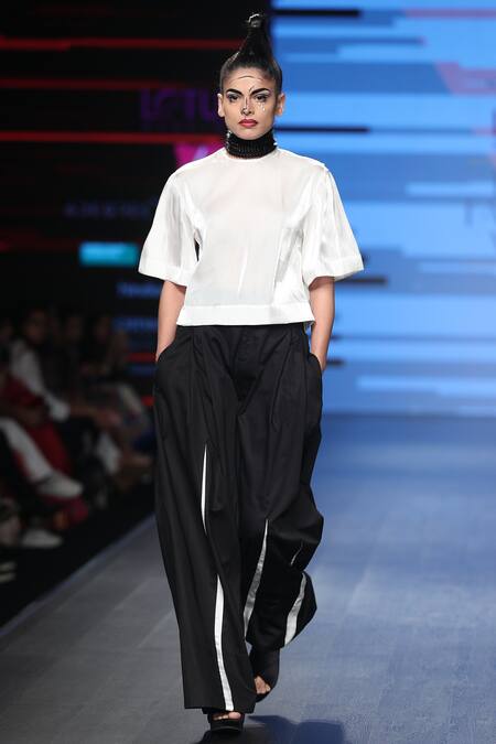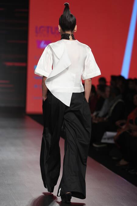Keeping it simple yet stylish is this pristine white shirt with attached back pattern and stunningly paired with black trousers styled in white abstract details.