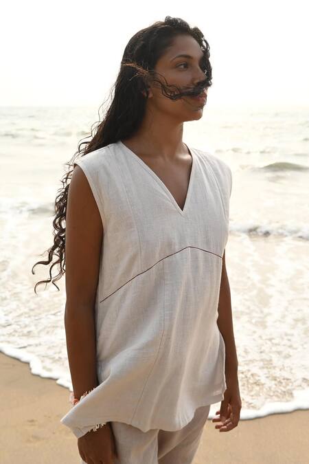 Beige top featuring a V-neckline and sleeveless design with contrast thread detailing
