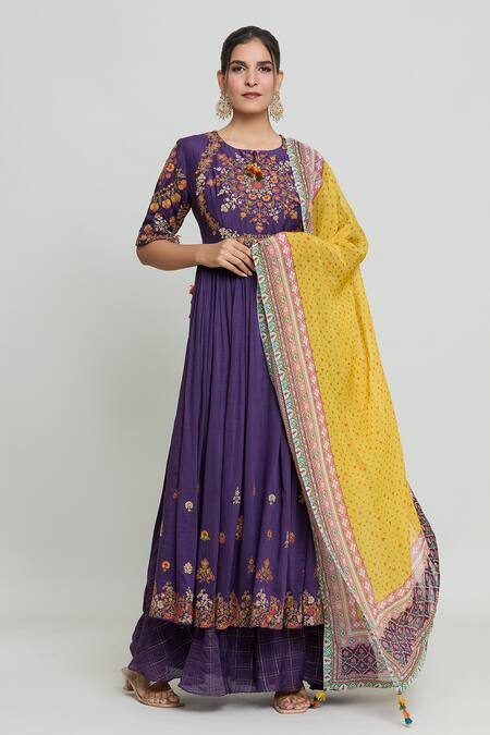 Purple elbow sleeve anarkali featuring gardenia phool multi-thread embroidery on the yoke and sleeves. Paired with a gold toned graphic checks pattern flared palazzo.