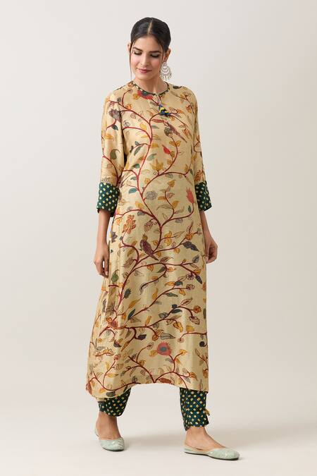 Buy_Shraddha Rambhia_Beige Silk Round Neck Kalamkari Gardenia Print Kurta With Pant_Online_at_Aza_Fashions
