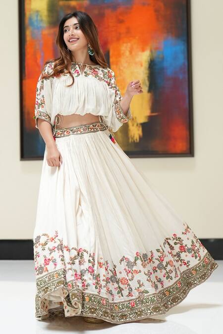 Buy_Shraddha Rambhia_Ivory Slub Silk Printed And Embroidered Thread Keyhole Pleated Lehenga & Top Set_at_Aza_Fashions