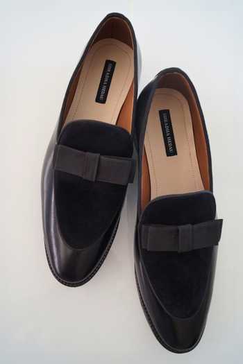 Black velvet suede moccasin shoes featuring bow detailing