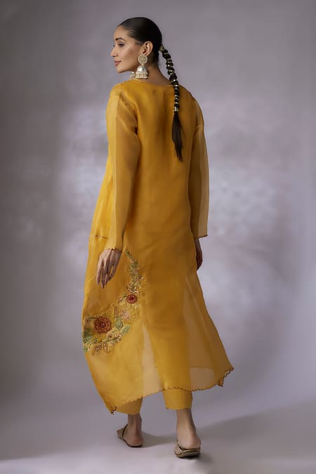 Yellow embroidered jacket featuring scalloped V neckline, full sleeves, and petunia garden applique. Paired with a matching sleeveless slip and straight pant in modal cotton.