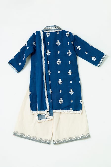 Blue kurta with dori and gota embroidery featuring a mandarin collar and three-quarter sleeves. Paired with a palazzo and a scallop border lace hem dupatta.