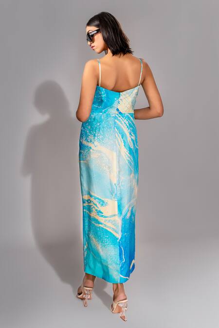 Cerulean blue sleeveless dress featuring an all-over marble print and a 3D structured flower on the bodice