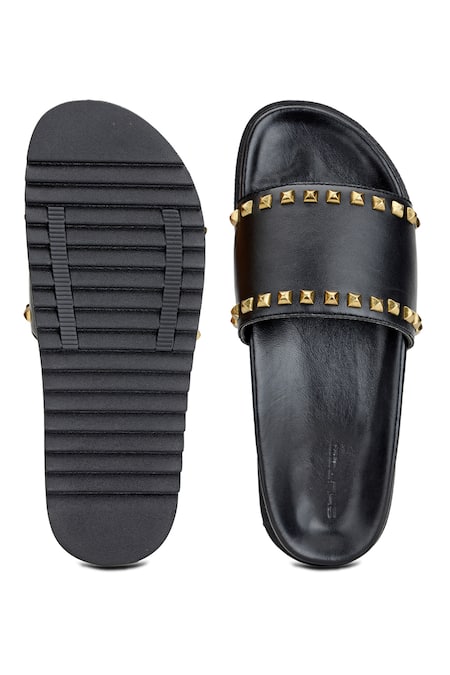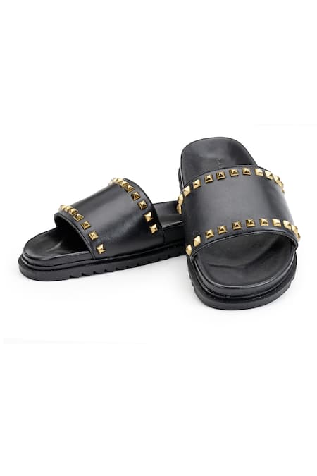 Black leather slides featuring a single strap embellished with small gold antique studs