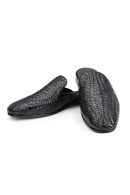 Black leather mules featuring a handwoven basket pattern and almond toe design