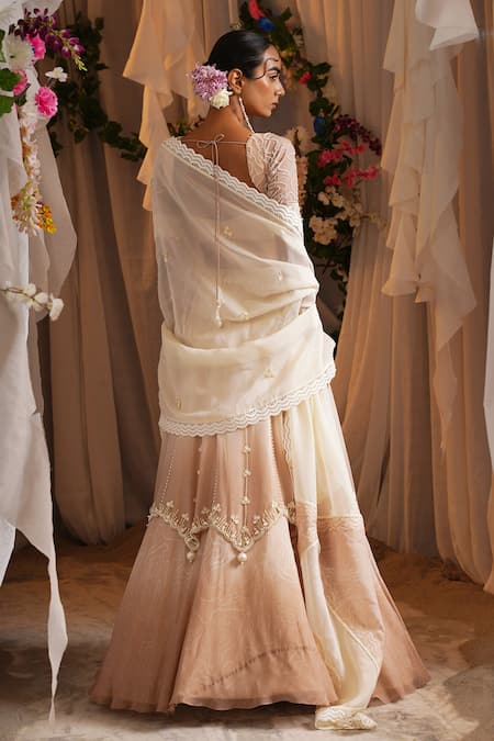 Ivory lehenga set in organza and cotton with pearl tassel embellishments and embroidered panels. The blouse features a structured corset-style bodice with padded cups and the set includes a panelled dupatta.