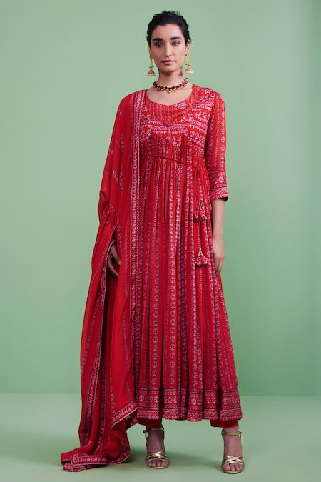 Red angrakha with all-over print & gathered flare. Comes with inner top, trousers & printed flat chiffon dupatta