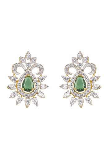 Teardrop cut green stone at the center, Intricate floral-inspired design around the main stone, White stones embellishing the gold plated setting