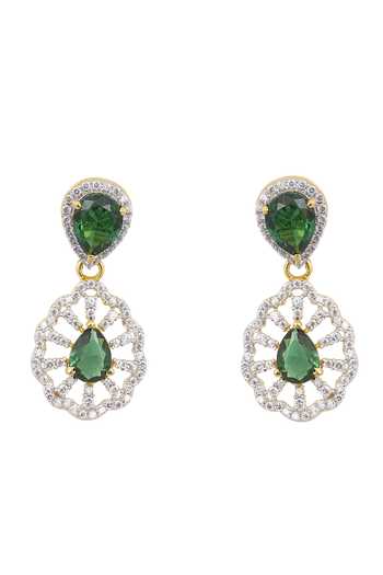 Green 925 Silver drop earrings featuring a pear-shaped green stone and a surrounding halo of cubic zirconia, with a gold-plated finish.