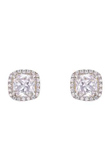 A pair of 925 silver stud earrings featuring a cushion-cut clear stone surrounded by smaller clear stones.