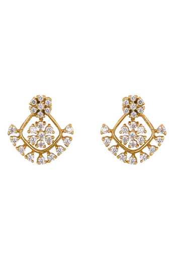 A pair of gold plated 925 silver stud earrings featuring a fan-shaped design adorned with white stones.