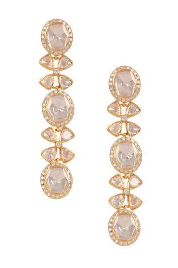Yellow dangler earrings featuring handcrafted floral and geometric cut work with moissanite polki and synthetic stones embellishment