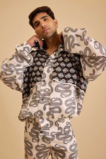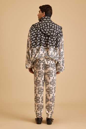 Off White bamberg satin jacket with lotus and snake print. Marshmallow tone and printed motifs define the design.