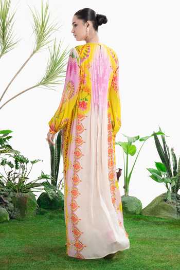 Multicolor crepe kaftan dress with pintuck front pleats & embroidered side panels.