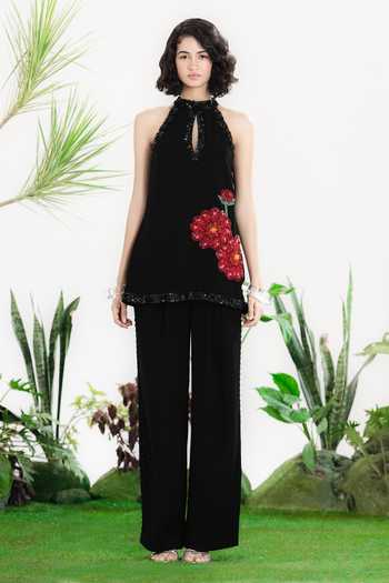 Black American Crepe top with red jelly-floral embroidery & black beadwork. Paired with straight-leg trousers.
