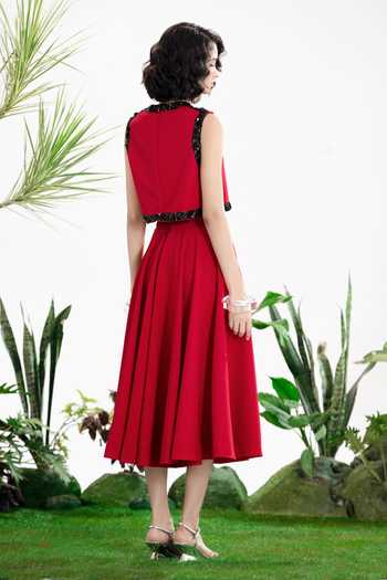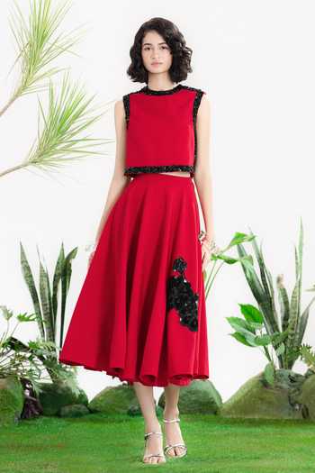 Red banana crepe crop top with black embroidered borders paired with a flared skirt featuring a black floral embroidered motif.