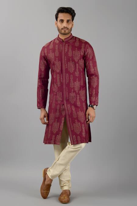 Purple embroidered kurta featuring a mandarin neck and full sleeves. Paired with matching pant made from muga silk.