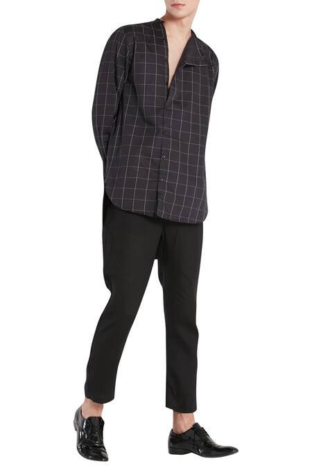 Sultry, quirky & swanky this black classic cotton shirt features check print all over with a quirky side button placket look.