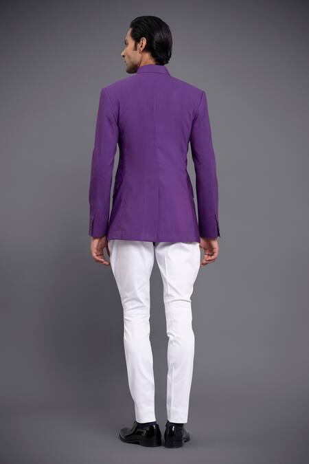 Purple silk bandhgala with stitchline detail and flap pockets in front.