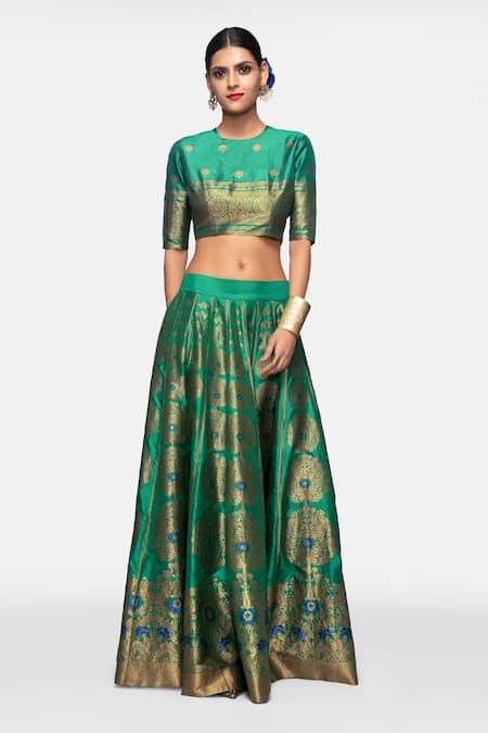 Emerald green blouse in handwoven silk brocade base with contrast motifs & crew neckline.