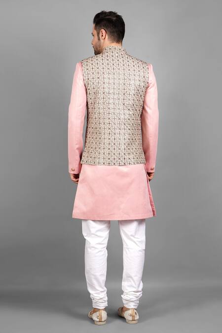 Pink silk bundi with floral embroidered motifs and welt pocket in front. Paired with a solid mandarin collar kurta and off white pants.