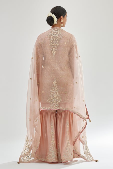 Pink silk chanderi kurta featuring intricate zari, dori, and gota embroidery with bead accents. Paired with tiered pants and a sheer tassel-bordered dupatta.