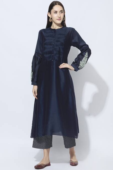 Blue long kurta with embroidered motifs on sleeves. Comes with printed pants & inner slip.