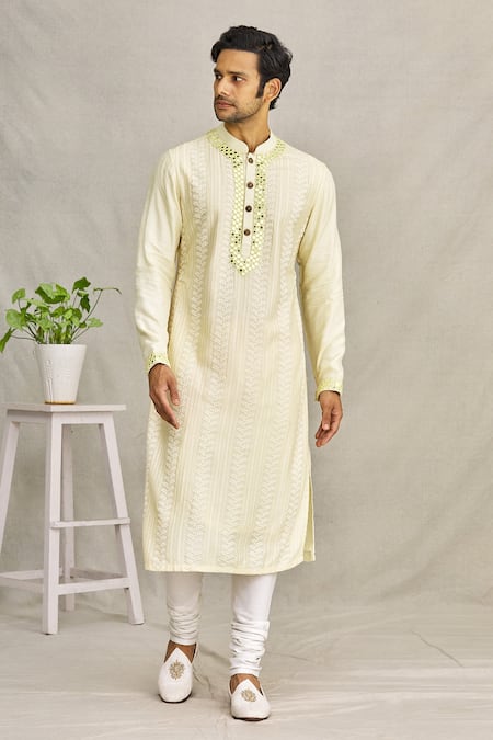 Buy_Yajy By Aditya Jain_Yellow Silk Chikankari And Mirror Kurta_at_Aza_Fashions