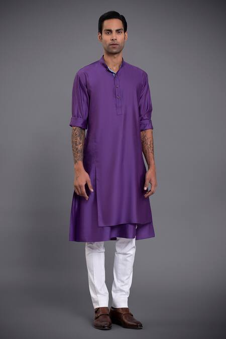 Purple achkan with floral embroidery and welt pocket in front. Comes with silk kurta and white jodhpuri breeches.